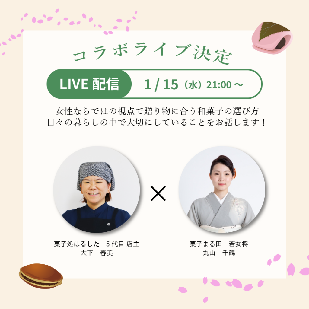 菓子処はるした 5代目店主&菓子まる田 若女将のコラボライブ(Instagram Live)をいたします